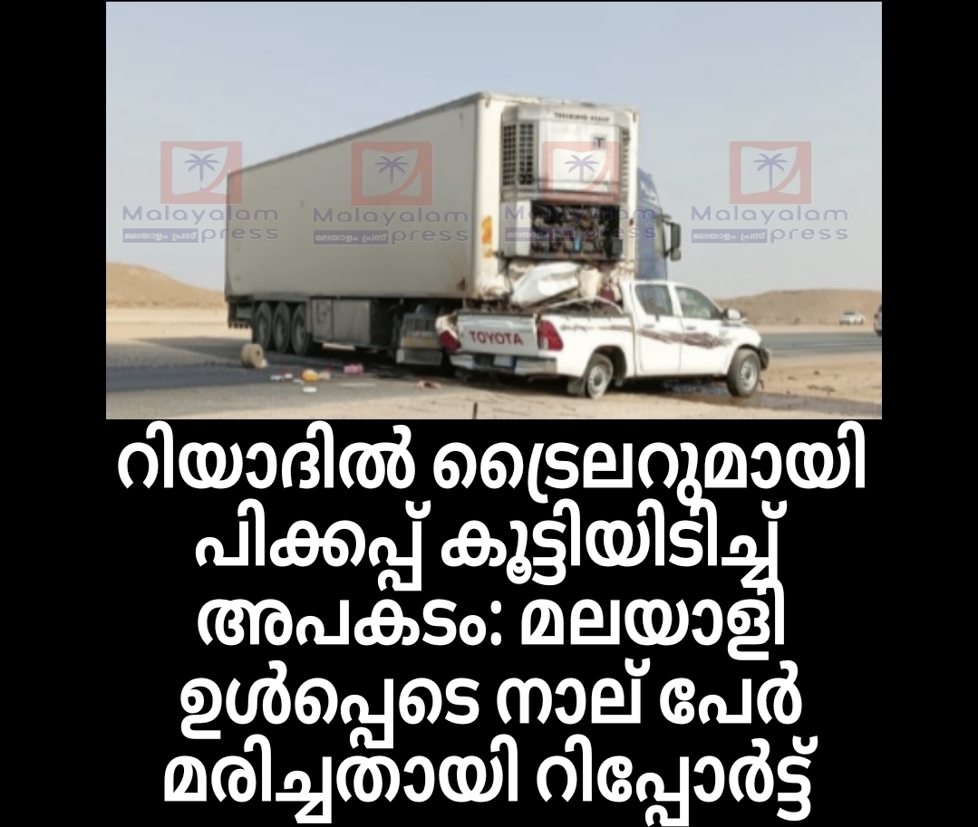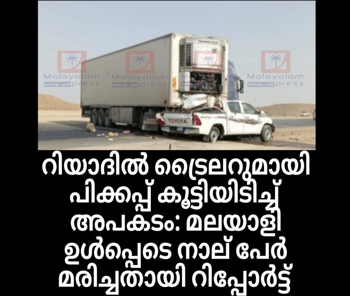 റിയാദിൽ ട്രൈലറുമായി പിക്കപ്പ് കൂട്ടിയിടിച്ച് അപകടം: മലയാളി ഉൾപ്പെടെ നാല് പേർ മരിച്ചു