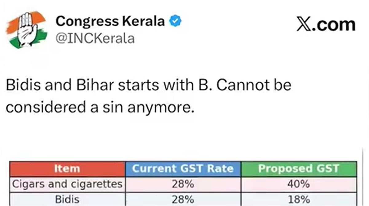 ബീഡിയും ബിഹാറും തുടങ്ങുന്നത് ബി-യിൽ നിന്നായതിനാൽ പാപമായി കാണാനാവില്ലെന്ന പോസ്റ്റാണ് വിവാദത്തിന് തിരികൊളുത്തിയത്. പുകയില ഉൽപ്പന്നങ്ങളുടെ ജിഎസ്ടി വെട്ടിക്കുറച്ചതിനെ പരാമർശിച്ചായിരുന്നു കോൺഗ്രസ് കേരളയുടെ എക്സ് പോസ്റ്റ്. ബീഡിക്ക് വിലകുറച്ചതിനെ ബിഹാറുമായി ബന്ധപ്പെടുത്തിയുള്ള പോസ്റ്റിനെതിരെ വ്യാപക വിമർശനം ഉയർന്നു.