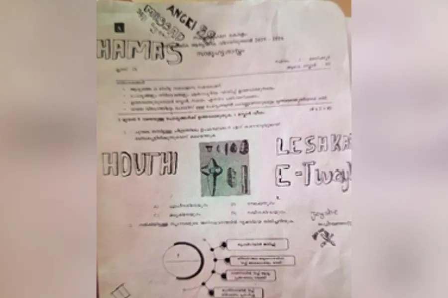 ചോദ്യക്കടലാസിന്റെ വലതുഭാഗത്ത് ലഷ്കർ ഇ ത്വയിബ, ജെയ്ഷെ മുഹമ്മദ് എന്നീ ഭീകരസംഘടനകളുടെ പേരും ഇടതുഭാഗത്ത് ഹമാസ്, ഹൂതി എന്നീ വാക്കുകളുമാണ് എഴുതിയിരിക്കുന്നത്. ഒരിടത്ത് മൊസാദ് എന്നും. പേരിന് നേരേതാഴെ തോക്കിൽനിന്ന് വെടിയുണ്ട ചിതറുന്ന ചിത്രവും രണ്ട് വാളുകളും വരച്ചിട്ടുണ്ട്. ഹമാസ്, ഹൂതി, ലഷ്കർ ഇ ത്വയിബ എന്നീ പേരുകൾ വലിയ അക്ഷരത്തിൽ എഴുതി.