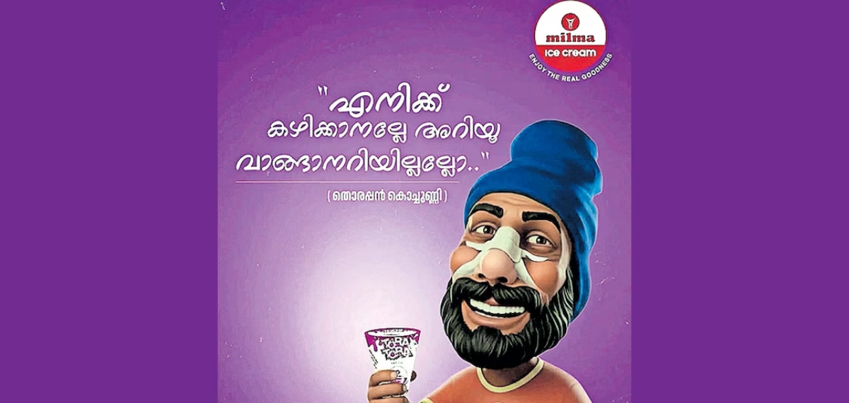 മൂക്കിന് മുകളില് പ്ലാസ്റ്റര് ഒട്ടിച്ച ആളാണ് പരസ്യത്തിലുള്ളത്. ‘എനിക്ക് കഴിക്കാനല്ലേ അറിയൂ, വാങ്ങാനറിയില്ലല്ലോ-തൊരപ്പന് കൊച്ചുണ്ണി’ എന്ന തലക്കെട്ടോടെയാണ് കാര്ഡ്. സിഐഡി മൂസ ചിത്രത്തില് ഹരിശ്രീ അശോകന്റെ കഥാപാത്രമാണ് തൊരപ്പന് കൊച്ചുണ്ണി. ഇതേ കഥാപാത്രം പറയുന്ന ഡയലോഗാണ് മില്മയുടെ കാര്ഡില് ഉപയോഗിച്ചിരിക്കുന്നത്.