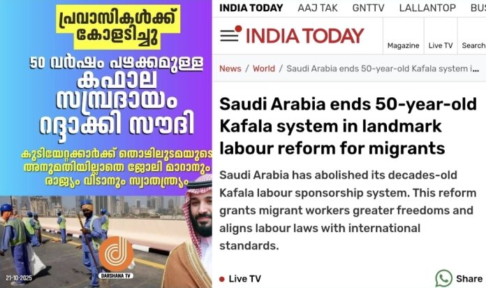 യഥാർത്ഥത്തിൽ 2021ൽ പുറത്ത് വന്ന വാർത്തയാണിത്. സഊദി തൊഴിൽ നിയമങ്ങൾ അന്താരാഷ്ട്ര നിലവാരത്തിനനുസരിച്ച് പരിഷ്കരിച്ചതായും, സ്പോൺസർഷിപ്പ് വ്യവസ്ഥകൾക്ക് പകരം തൊഴിൽ കരാറുകൾക്ക് രൂപപ്പെടുത്തുമെന്നും അന്ന് സഊദി തൊഴിൽ സാമുഹിക വികസന മന്ത്രാലയം പ്രഖ്യാപിച്ചിരുന്നു.
