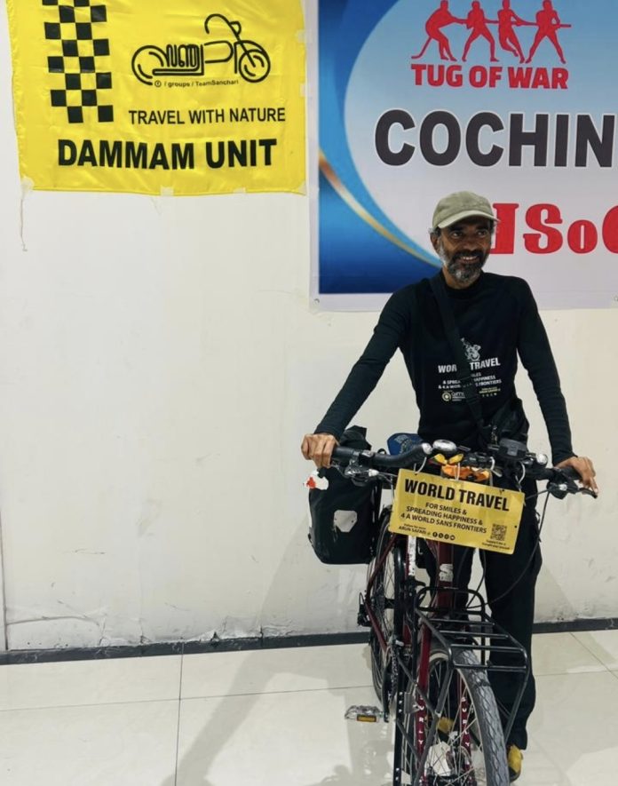 ദമാം: സൈക്കിളിൽ ഉലകം ചുറ്റുന്ന എറണാകുളം അമ്പലമേട് സ്വദേശിയായ അരുൺ ഥാഗത് സഊദിയിലെത്തി. സമാധാന സന്ദേശവുമായി 2024 ൽ പാരീസിലെ ഒളിമ്പിക് വേദിയിൽ നിന്ന് കൊച്ചിയിലേക്ക് സൈക്കിൾ ചവിട്ടുകയാണ് ഈ യുവാവ്. നിരവധി രാജ്യങ്ങൾ താണ്ടിയ അരുൺ യൂറോപ്പ് വഴി തുർക്കിയിലൂടെയാണ് അറബ് മണ്ണിലേക്ക് പ്രവേശിച്ചത്. നിലവിൽ സഊദിയിലെ റിയാദിൽ നിന്ന് കിഴക്കൻ സഊദിയിലെത്തിയിരിക്കുയാണ് അരുൺ.