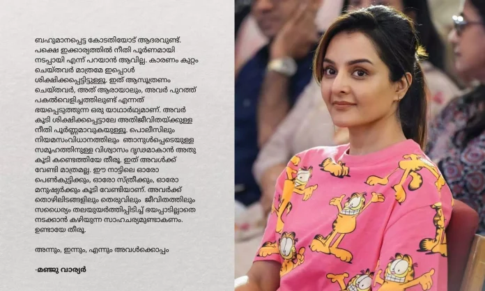 തിരുവനന്തപുരം: നടിയെ ആക്രമിച്ച കേസിൽ വിധി വന്നതിന് പിന്നാലെ പ്രതികരണവുമായി നടി മഞ്ജു വാര്യർ. നീതി നടപ്പായില്ലെന്നും കുറ്റം ചെയ്തവർ മാത്രമാണ് ശിക്ഷിക്കപ്പെട്ടതെന്നും പറഞ്ഞ മഞ്ജു ആസൂത്രണം ചെയ്തവർ ആരായാലും അവർ പുറത്ത് പകൽ വെളിച്ചത്തിലുണ്ടെന്നത് ഭയപ്പെടുത്തുന്ന യാഥാർഥ്യമാണെന്നും സാമൂഹിക മാധ്യത്തിൽ പങ്കുവെച്ച പോസ്റ്റിൽ പറയുന്നു. അവർ കൂടി ശിക്ഷിക്കപ്പെട്ടാൽ മാത്രമേ അതിജീവിതയ്ക്കുള്ള നീതി പൂർണമാവുകയുള്ളൂ എന്നും മഞ്ജു പ്രതികരിച്ചു.