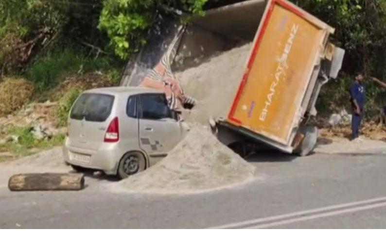 ടയര് പൊട്ടി നിയന്ത്രണം വിട്ട ടിപ്പര് ലോറി കാറിന് മുകളിലേക്ക് മറിയുകയായിരുന്നു. ആക്കുളത്തു നിന്നും കുളത്തൂര് ഭാഗത്തേക്ക് എം സാന്ഡുമായി പോയ ടിപ്പര് ലോറിയാണ് അപകടത്തില്പ്പെട്ടത്. ലോറിയില് ഉണ്ടായിരുന്ന മണല് കാറിന് മുകളിലേക്ക് വീണു.