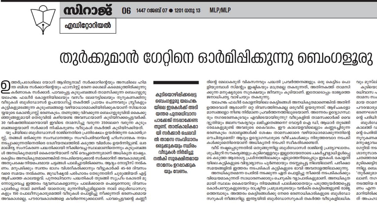 സ്ത്രീകളും കുട്ടികളുമടങ്ങുന്ന കുടുംബങ്ങളെ സിദ്ധരാമയ്യയുടെ കോൺഗ്രസ് ഭരണകൂടം വഴിയാധാരമാക്കി. ബുൾഡോസറുകളും പൊലീസുകാരുമെത്തി വീടുകൾ പൊളിച്ചു നീക്കുന്നത് ഭരണപരമായ അവകാശമല്ല, പൗരവകാശങ്ങളെ കവർന്നെടുക്കലാണെന്നും എഡിറ്റോറിയൽ പറയുന്നു. യെലഹങ്ക ഫഖീർ കോളനിയിലെ കെട്ടിടങ്ങൾ അനധികൃതമാണെങ്കിൽ അതിനു ഉത്തരവാദി ആരാണെന്നും സിറാജ് എഡിറ്റോറിയലിൽ ചോദ്യമുന്നയിക്കുന്നുണ്ട്.