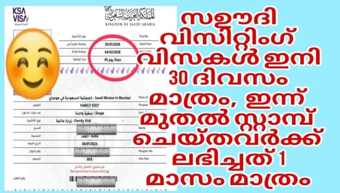ഇന്ന് മുതൽ ഇഷ്യു ചെയ്ത വിസകളിൽ കൃത്യമായി ഒരു മാസം കാലാവധി രേഖപ്പെടുത്തിയാണ് ഇഷ്യു ചെയ്തത്. ഫാമിലി സന്ദർശക വിസ കൂടാതെ, ടൂറിസം, ബിസിനസ് വിസ ഉൾപ്പെടെ മുഴുവൻ സന്ദർശക വിസകളുടെയും കാലാവധിയും ഒരു മാസം മാത്രമാക്കി കുറച്ചിട്ടുണ്ട്. നിലവിലെ തീരുമാനം ഹജ്ജിനു മുന്നോടിയായുള്ള ഒരുക്കങ്ങളുടെ ഭാഗമാണെന്നാണ് വിവരം.