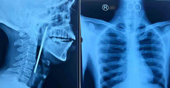 അന്നനാളത്തിൽ കത്രിക കുടുങ്ങി കിടക്കുന്നതായി എക്സറേ പരിശോധനയിൽ കണ്ടെത്തി. തുടർന്ന് രോഗിയെ ഇഎൻടി വിഭാഗത്തിൽ പ്രവേശിപ്പിച്ചു.