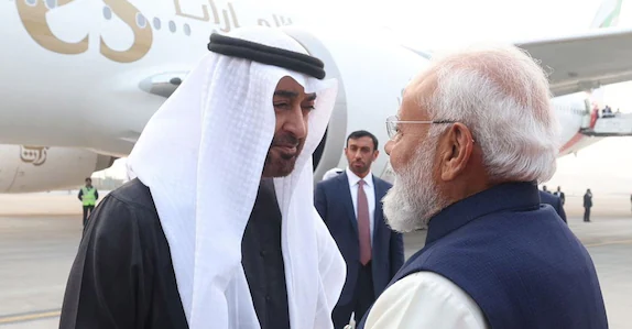 ന്യൂഡൽഹി: യുഎഇ പ്രസിഡന്റും അബുദാബി ഭരണാധികാരിയുമായ ഷെയ്ഖ് മുഹമ്മദ് ബിൻ സായിദ് അൽ നഹ്യാനെ വിമാനത്താവളത്തിൽ എത്തി സ്വീകരിച്ച് പ്രധാനമന്ത്രി നരേന്ദ്ര മോദി. രണ്ട് മണിക്കൂർ മാത്രം നീണ്ടുനിന്ന ഇന്ത്യാ സന്ദർശനത്തിനായി എത്തിയതായിരുന്നു ഷെയ്ഖ് മുഹമ്മദ് ബിൻ സായിദ് അൽ നഹ്യാന്‍.