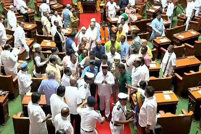 കർണാടകയിലും നാടകീയത; പ്രസംഗം വെട്ടിച്ചുരുക്കി ഗവർണർ ഇറങ്ങി, തടയാൻ ശ്രമിച്ച് കോൺഗ്രസ് MLAമാർ