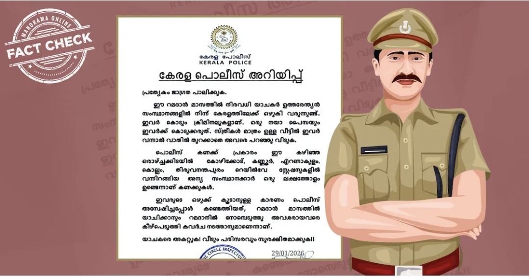 ഉത്തരേന്ത്യയില്‍നിന്നും ക്രിമിനല്‍ പശ്ചാത്തലമുള്ള യാചകര്‍ റമദാൻ മാസത്തിൽ കേരളത്തിലേക്കു വരുന്നുണ്ടെന്നും പൊതുജനങ്ങള്‍ ജാഗ്രത പാലിക്കണമെന്നും കേരള പൊലീസിന്റെ പേരില്‍ ഒരു അറിയിപ്പ് സമൂഹമാധ്യമങ്ങളിൽ പ്രചരിക്കുന്നുണ്ട്. ഇതിന്റെ യാഥാർഥ്യമെന്തെന്ന് വ്യക്തമാക്കുന്നതാണ് മനോരമ ഓൺലൈൻ ഫാക്ട് ചെക്ക് ഹെൽപ്പ്ലൈൻ. വാസ്തവമെന്തെന്ന് പരിശോധിക്കാം.