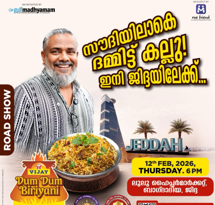 ജിദ്ദ: നജ്റാനും അബഹയും ജുബൈലും കീഴടക്കിയ രുചിപ്പടയോട്ടം ഇനി കടൽനഗരമായ ജിദ്ദയിലേക്ക്. മീഫ്രൻഡ് ഒരുക്കുന്ന ‘വിജയ് ദം ദം ബിരിയാണി’ മാമാങ്കത്തിന്റെ ആവേശകരമായ മെഗാ റോഡ് ഷോ ഫെബ്രുവരി 12 വ്യാഴാഴ്ച ജിദ്ദയിൽ അരങ്ങേറും. ജിദ്ദ ബാഗ്ദാദിയ ഡിസ്ട്രിക്റ്റിലെ ലുലു ഹൈപ്പർ മാർക്കറ്റിൽ വൈകുന്നേരം 6 മണിക്ക് ആരംഭിക്കുന്ന പരിപാടിയിൽ പ്രശസ്ത അവതാരകനും ഫുഡ് വ്ളോഗറുമായ രാജ് കലേഷ് (കല്ലു) മുഖ്യാതിഥിയായി എത്തുന്നതോടെ ജിദ്ദയിലെ പ്രവാസി മലയാളി കുടുംബങ്ങൾക്ക് അത്യാവേശകരമായ ഒരു സന്ധ്യയാകും സമ്മാനിക്കപ്പെടുക.