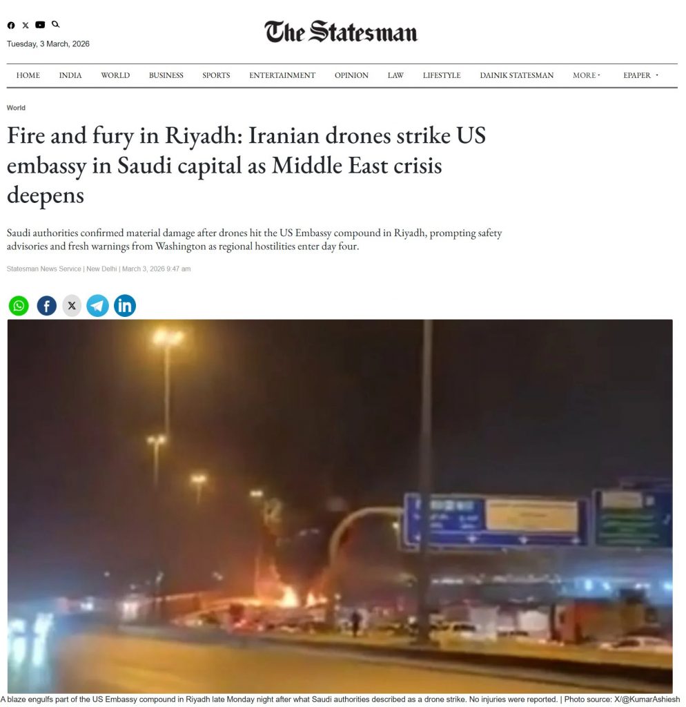 ന്യൂഡൽഹി: ഇറാനും യുഎസ്-ഇസ്റാഈൽ സഖ്യവും തമ്മിലുള്ള വർദ്ധിച്ചുവരുന്ന സംഘർഷങ്ങൾക്കിടയിൽ, 2026 മാർച്ച് 3 ന് സഊദി അറേബ്യയിലെ റിയാദിലുള്ള യുഎസ് എംബസിയിൽ ഡ്രോണുകൾ ആക്രമണം നടത്തി. ആക്രമണത്തിൽ ചെറിയ നാശനഷ്ടങ്ങൾ സംഭവിച്ചതായും ആളപായമൊന്നും റിപ്പോർട്ട് ചെയ്തിട്ടില്ലെന്നും റിപ്പോർട്ടുണ്ട്. അതേസമയം, റോഡിന്റെ വശത്ത് വൻതോതിൽ തീജ്വാലകൾ പടരുന്നത് കാണിക്കുന്ന ഒരു വീഡിയോ സോഷ്യൽ മീഡിയയിൽ വൈറലാകുകയാണ്.