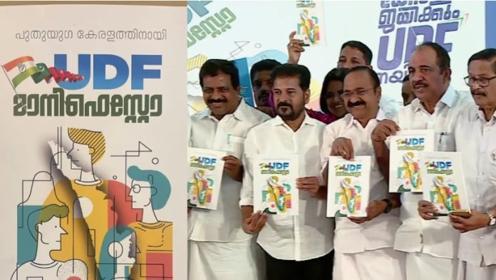 തിരുവനന്തപുരം: നിയമസഭാ തെരഞ്ഞെടുപ്പിനോടനുബന്ധിച്ച് വമ്പൻ വാഗ്ദാനങ്ങളുമായി യുഡിഎഫ് പ്രകടനപത്രിക പുറത്തിറക്കി. രാവിലെ പത്ത് മണിക്ക് കൊച്ചിയില്‍ നടന്ന ചടങ്ങില്‍ രേവന്ത റെഡ്ഡിയാണ് പ്രകടനപത്രിക പുറത്തിറക്കിയത്. ശബരിമലയിലെ ആചാര സംരക്ഷണത്തിൽ നിന്നും സാമൂഹിക ക്ഷേമ പദ്ധതികളിലേക്കുള്ള വിവിധ പ്രഖ്യാപനങ്ങളാണ് പ്രകടന പത്രികയിലെ പ്രധാന ആകർഷണം. രാഹുൽ ഗാന്ധി പ്രഖ്യാപിച്ച ഗാരന്‍റികൾക്കാണ് യുഡിഎഫ് പ്രകടനപത്രികയില്‍ മുൻഗണന. സാമൂഹിക സുരക്ഷാ പെൻഷൻ അവകാശമായി പ്രഖ്യാപിക്കും.