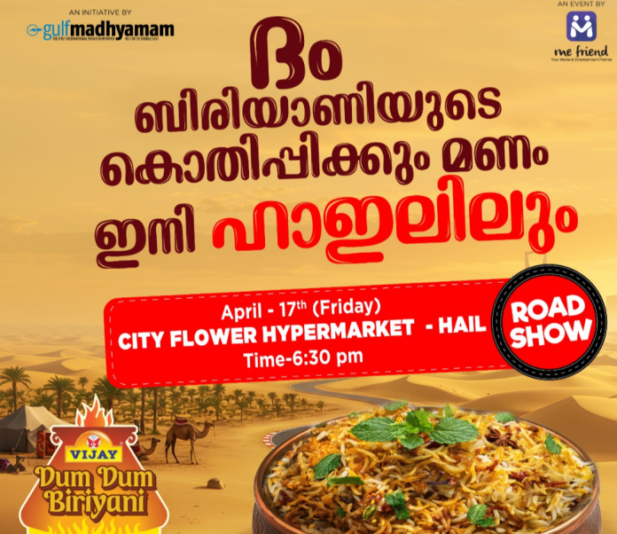 ഹായിൽ: പാചകപ്രേമികൾക്കും ഭക്ഷണപ്രിയർക്കും ഒരുപോലെ ഉത്സവമായി ഗൾഫ് മാധ്യമം ഒരുക്കുന്ന സൗദിയിലെ ഏറ്റവും വലിയ ബിരിയാണി മാമാങ്കം ‘വിജയ് ദം ദം ബിരിയാണി’ റോഡ് ഷോ ഹായിലിലേക്ക് എത്തുന്നു. ആരാകും സൗദിയിലെ ബിരിയാണി രാജാ എന്ന ചോദ്യത്തിനുള്ള ഉത്തരത്തിലേക്കുള്ള ആവേശകരമായ മത്സരങ്ങളാണ് ഹായിലിൽ അരങ്ങേറാൻ പോകുന്നത്.