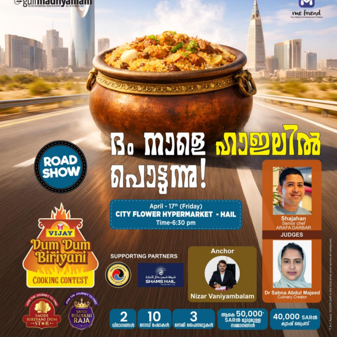 റിയാദ്: ‘ഗൾഫ് മാധ്യമം’ സംഘടിപ്പിക്കുന്ന ‘വിജയ് ദംദം ബിരിയാണി’ മെഗാ റോഡ് ഷോ വെള്ളിയാഴ്ച ഹാഇലിൽ അരങ്ങേറും. വൈകീട്ട് 6.30 മുതൽ ഹാഇലിലെ സിറ്റിഫ്ലവർ ഹൈപ്പർമാർക്കറ്റിലാണ് പരിപാടി.