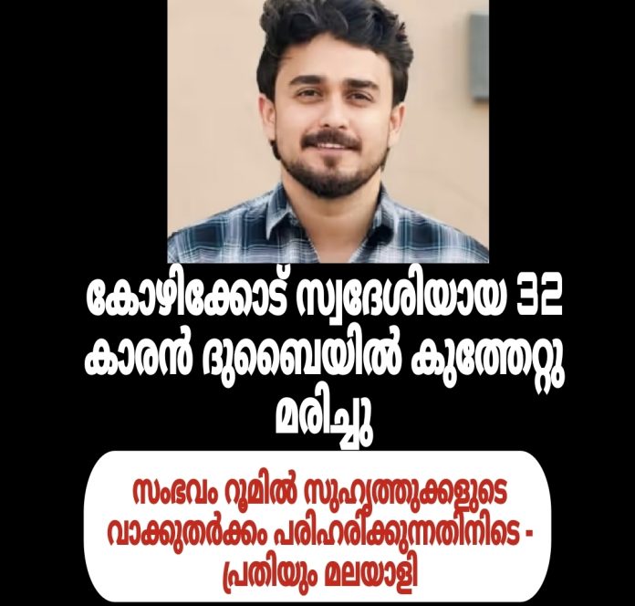 കോഴിക്കോട്: ദുബായിൽ മലയാളിയുവാവ് കുത്തേറ്റ് മരിച്ചു. കോഴിക്കോട് ചെറുവണ്ണൂർ മധുരബസാർ സ്വദേശി നജാത്ത് മൻസിലിൽ ജസീൽ ആണ് മരിച്ചത്. 32 വയസ്സായിരുന്നു. ജസീൽ താമസിക്കുന്ന മുറിയിലെ സുഹൃത്തുക്കളുടെ വാക്കുതർക്കം പരിഹരിക്കുന്നതിനിടെ സുഹൃത്തിൽ നിന്ന് കുത്തേറ്റാണ് മരണം.